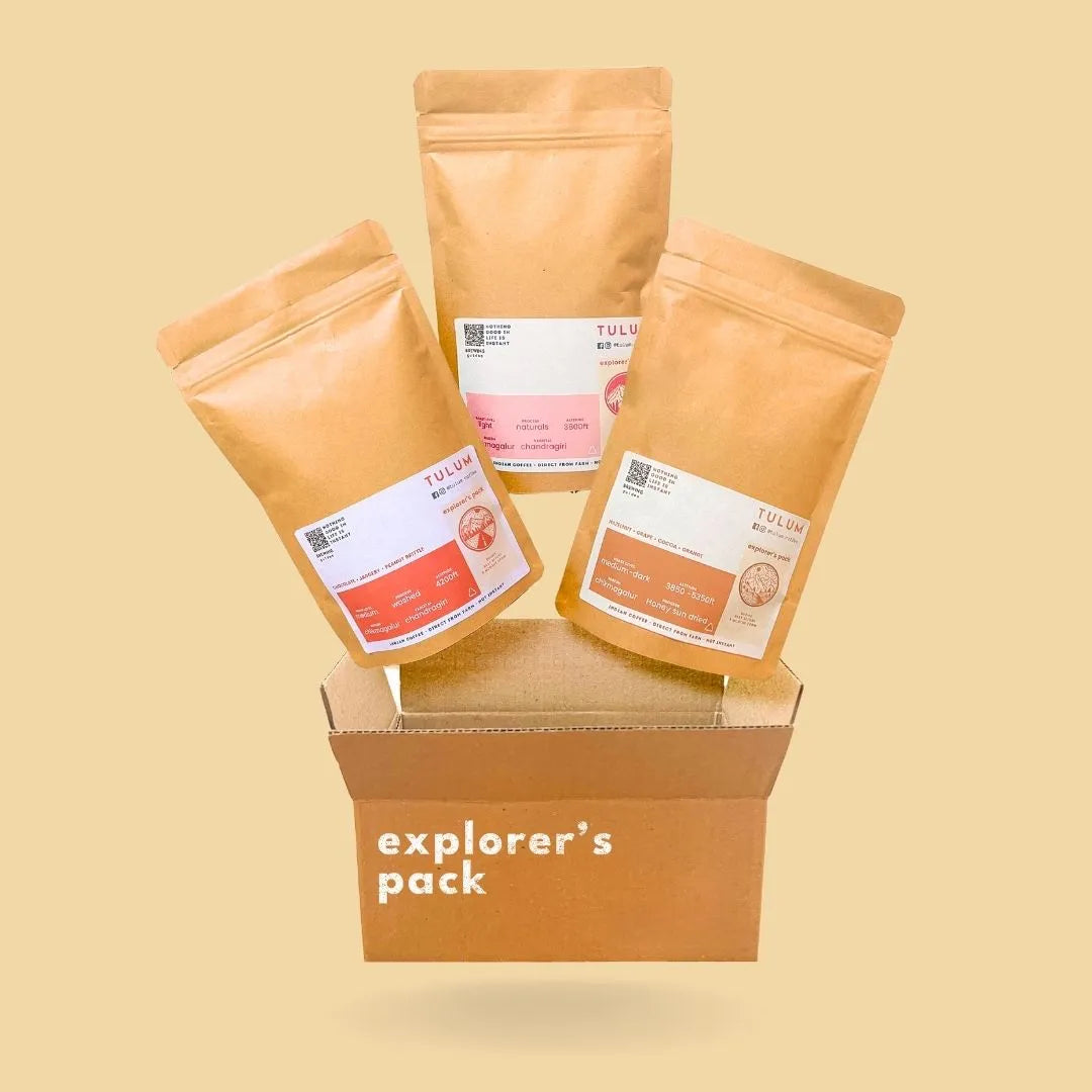 Our Explorers Box is a coffee sampler box featuring three different 75g bags of freshly roasted /ground coffee from different farms in India!